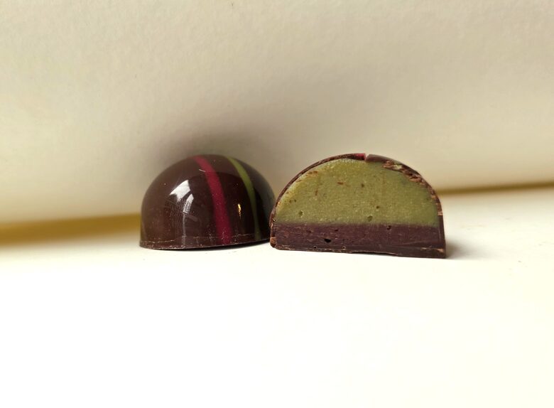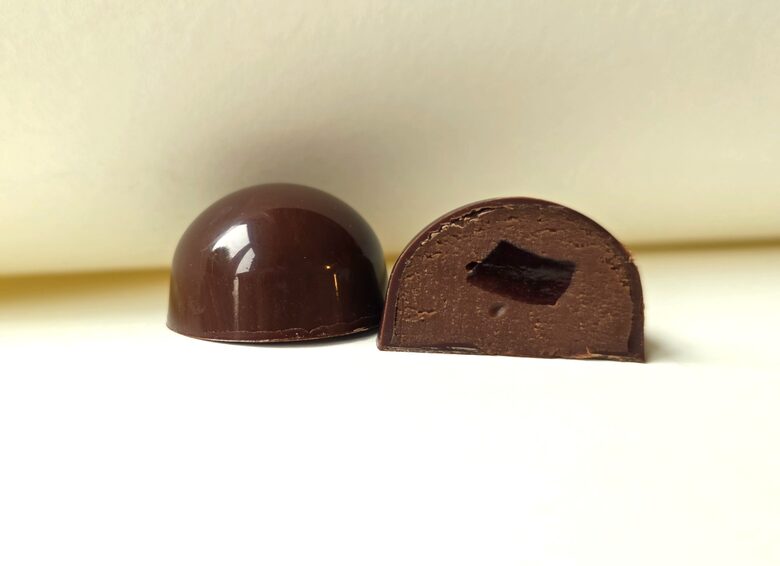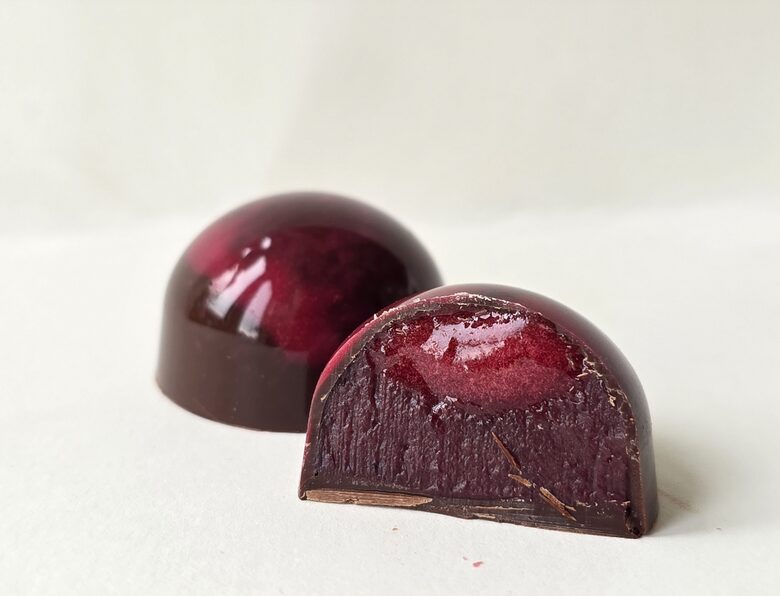 Ķiršu gēls, gabaliņš no cukurotā ķirša, tad nedaudz tonkas pupiņas krēma un tumšās šokolādes krauksķis. Maza konfekte, kas slēpj sevī četras sastāvdaļas un tās kopā rada lielisku garšu saspēli.