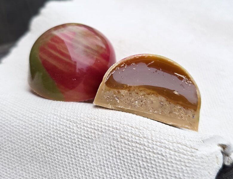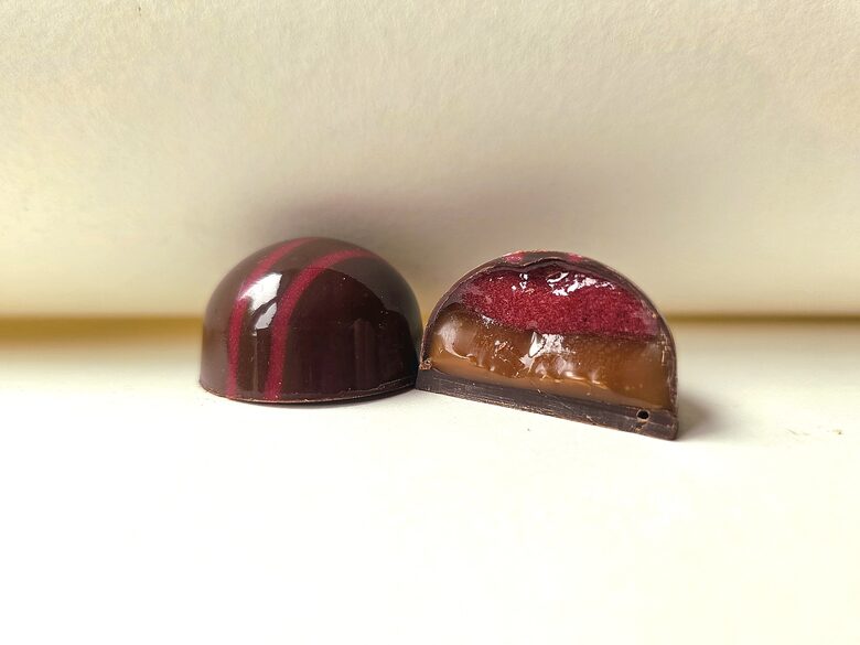 Karamele ar izteiktu iesala garšu kombinācijā ar skābi rūgteno brūkleņu gēlu rada lielisku saspēli. Tas viss ietverts tumšās šokolāde kausiņā.