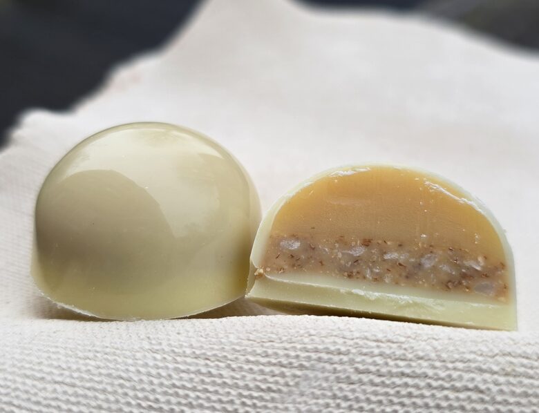 Krēmīgs kokosriekstu krēms ar krauksķīgu pamatnīti, kurā ir gan vafeles, gan grauzdēts kokosrieksts. Tas viss baltajā šokolādē.
