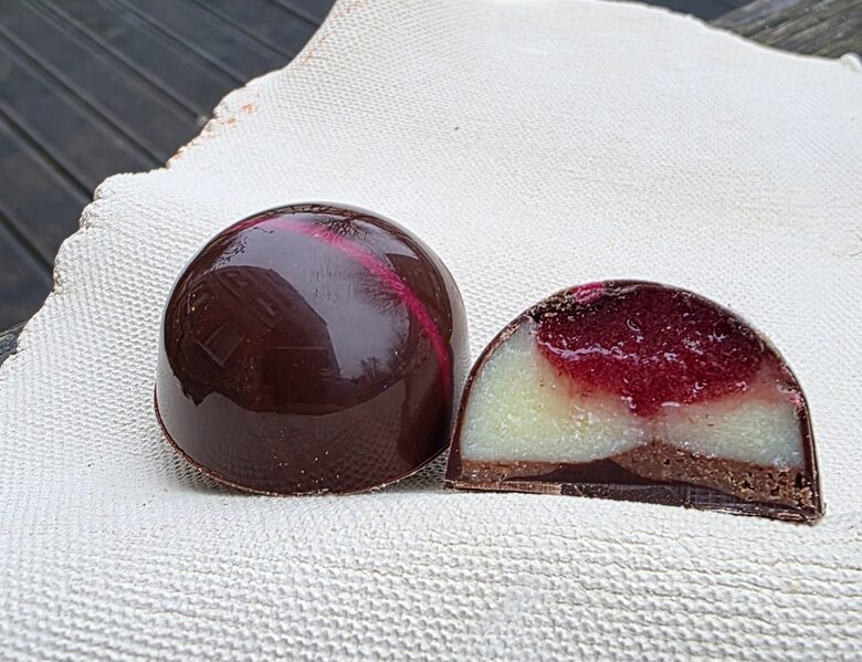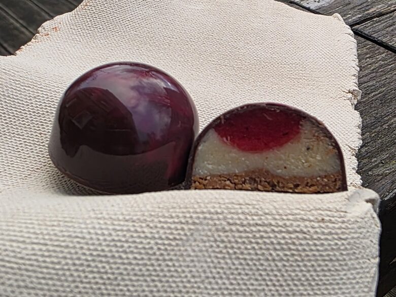 Ķiršu gēls, baltās šokolādes- tonkas pupiņu krēms un tumšās šokolādes krauksķis. Lieliska garšu saspēle mazā konfektē.